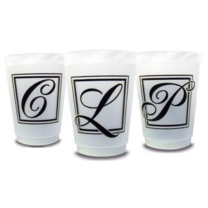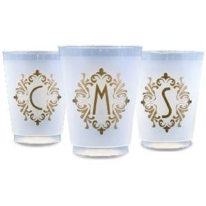 A frosted plastic shatterproof cup printed with your initials is like 'personalized light'. Plus, it's more meaningful than a plain frost-flex cup, especially with one of our classy pre-printed initials. We offer three very different initial designs. Bellevue Initial: Highly ornate border with a metallic gold finish. News Initial: Less ornate border with classic serif font initials. Majestic Initial: Smooth border with classy script initials. Each allows you to add a single letter of your choice. Or, complete the first, middle, and last name initials for a matching set. Whether you keep it simple or get ambitious, you can rely on the printing quality to be as beautiful as the design. Great for teacher and hostess gifts, and easy-peasy to order. Selecting the design, entering your initials and ordering are a virtual walk in the park. If you want to make it easy yet special, our frosted plastic initials are just the thing. Click "Buy Now" to take a test drive.